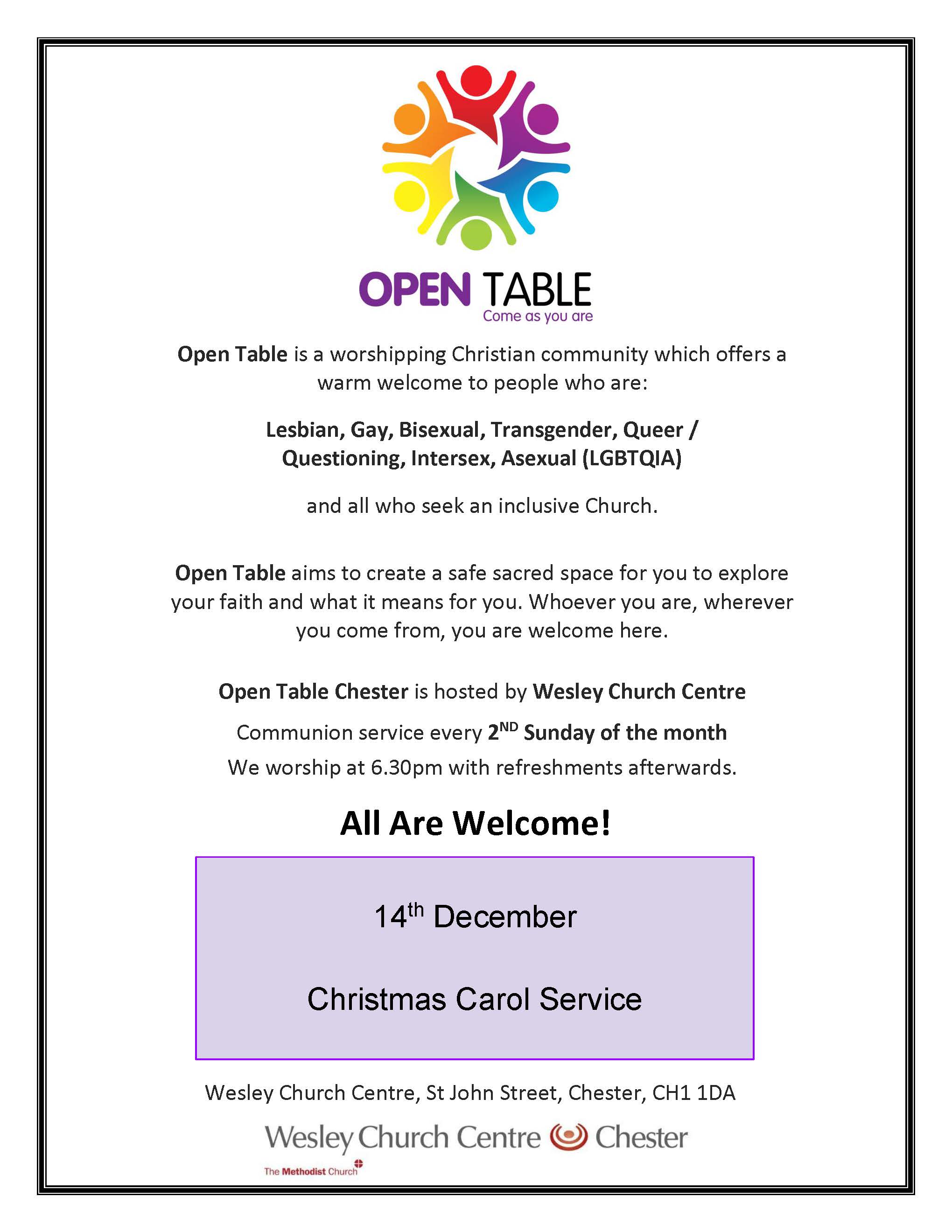 Open Table Carols Sunday 14th December 6.30pm For LGBTQIA+ folk and all who seek an inclusive church |